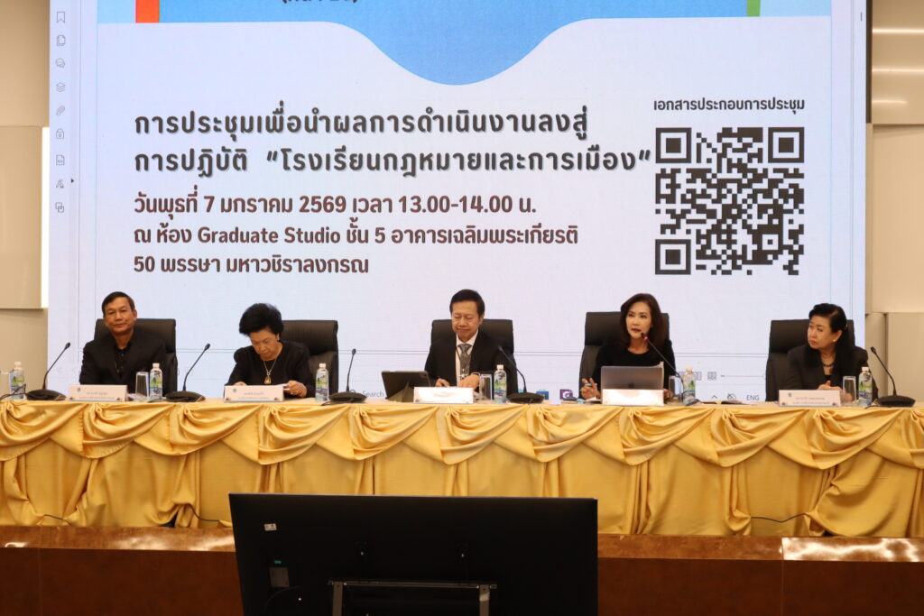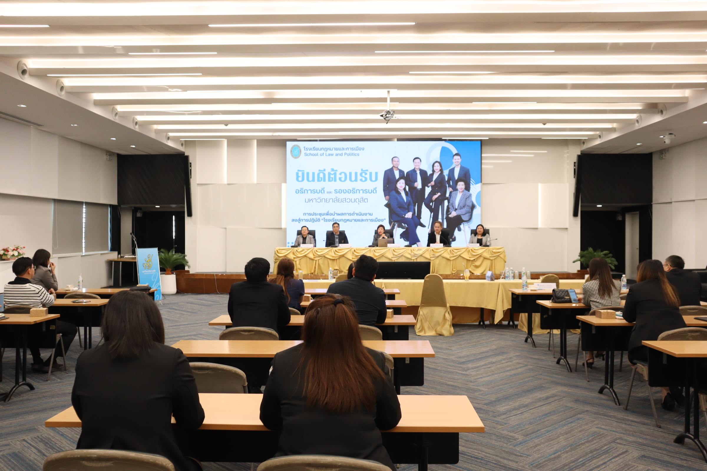 และ ผศ.ดร.พรชณิตว์ แก้วเนตร รองอธิการบดีฝ่ายวิชาการและกิจการต่างประเทศ ในหัวข้อ “จากคุณภาพสู่มาตรฐานสากล: นโยบายด้านวิชาการและความร่วมมือระหว่างประเทศ” พร้อมด้วยข้อเสนอแนะจากรองอธิการบดีทุก ๆ ท่าน พร้อมการนำเสนอแผนการดำเนินงานโดยคณะผู้บริหารโรงเรียนกฎหมายและการเมือง ได้แก่ ผศ.ดร.อานุภาพ รักษ์สุวรรณ รองคณบดีฝ่ายวิชาการและนวัตกรรม อาจารย์ภิญโญ คูวัฒนาเสนีย์ รองคณบดีฝ่ายกิจการนักศึกษาและบริการสังคม ผศ.ดร.เอกอนงค์ ศรีสำอางค์ ผู้ช่วยคณบดีฝ่ายวิจัยและการประกันคุณภาพ ผศ.กัญญกานต์ เสถียรสุคนธ์ ผู้ช่วยคณบดีฝ่ายวิเทศสัมพันธ์ ในวันพุธที่ 7 มกราคม พ.ศ. 2569 เวลา 13.00–15.30 น. ณ ห้องประชุม The Graduate Studio ชั้น 5 อาคารเฉลิมพระเกียรติ 50 พรรษา มหาวชิราลงกรณ (แยกสวนรื่นฤดี)