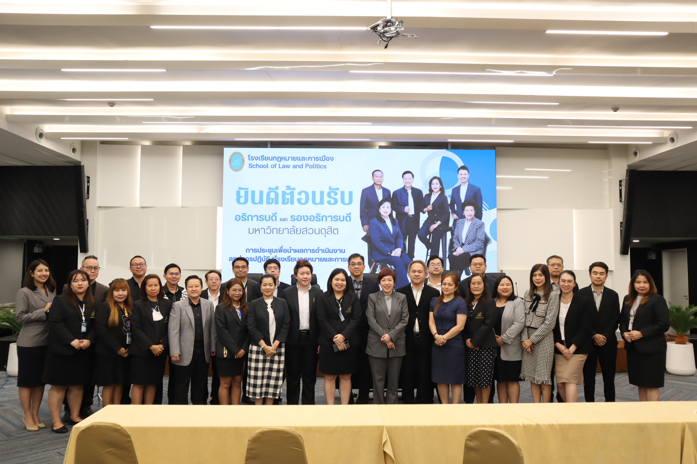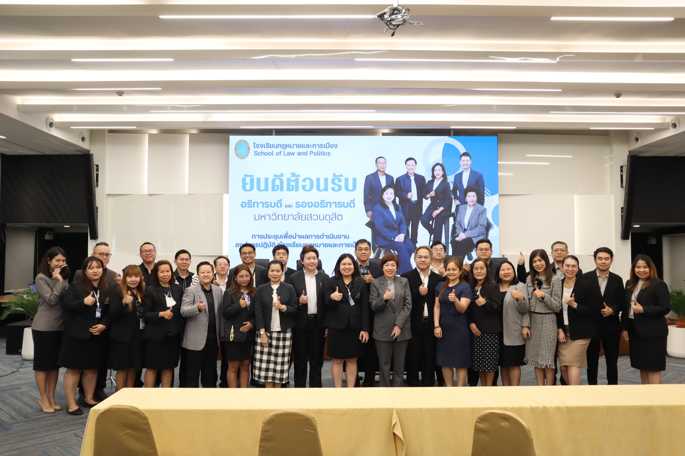 โรงเรียนกฎหมายและการเมือง มหาวิทยาลัยสวนดุสิต จัดประชุมเพื่อรับฟังนโยบายการดำเนินงานของโรงเรียนกฎหมายและการเมือง โดย ดร.งามประวัณ เอ้สมนึก คณบดีโรงเรียนกฎหมายและการเมือง กล่าวต้อนรับคณะผู้บริหารมหาวิทยาลัยสวนดุสิต พร้อมกล่าวบรรยายบริบทของโรงเรียนฯ และภาพในอนาคต ในหัวข้อ “จากความสำเร็จสู่บทต่อไปของโรงเรียนกฎหมายและการเมือง” จากนั้นเป็นการมอบนโยบายจากคณะผู้บริหารของมหาวิทยาลัยสวนดุสิต นำโดยผศ.ดร.พิทักษ์ จันทร์เจริญ อธิการบดีมหาวิทยาลัยสวนดุสิต ในหัวข้อ“ทิศทางและบทบาทของโรงเรียนกฎหมายและการเมือง ในฐานะอัตลักษณ์ที่ 5 ของมหาวิทยาลัยสวนดุสิต”