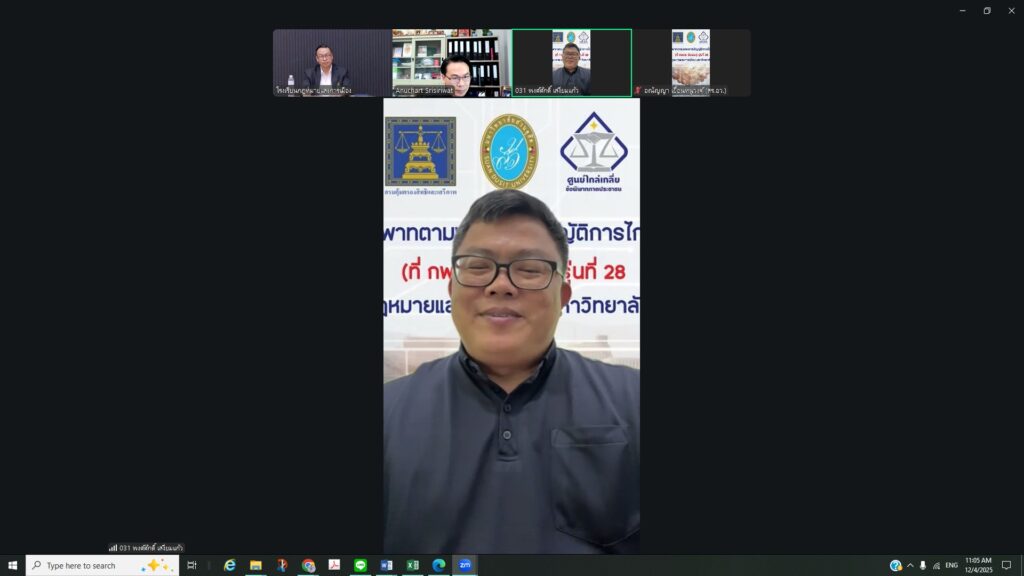 ผศ.สรศักดิ์ มั่นศิลป์ รองคณบดีโรงเรียนกฎหมายและการเมือง เป็นประธานการดำเนินงานจัดกิจกรรมประเมินผลการจัดอบรมหลักสูตรไกล่เกลี่ยข้อพิพาทตามพระราชบัญญัติการไกล่เกลี่ยข้อพิพาท พ.ศ 2562 (ที่ กพยช.รับรอง) รุ่นที่ 28 วันพฤหัสที่ 4 ธันวาคม 2568 ณ ห้องออนไลน์ 02 อาคารเฉลิมพระเกียรติ 50 พรรษามหาวชิราลงกรณ และผ่านระบบออนไลน์ ZOOM