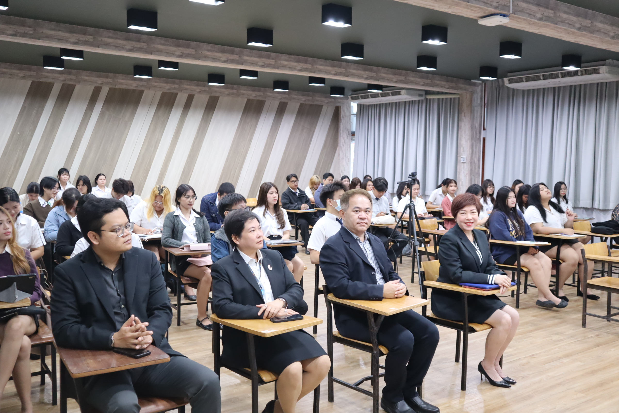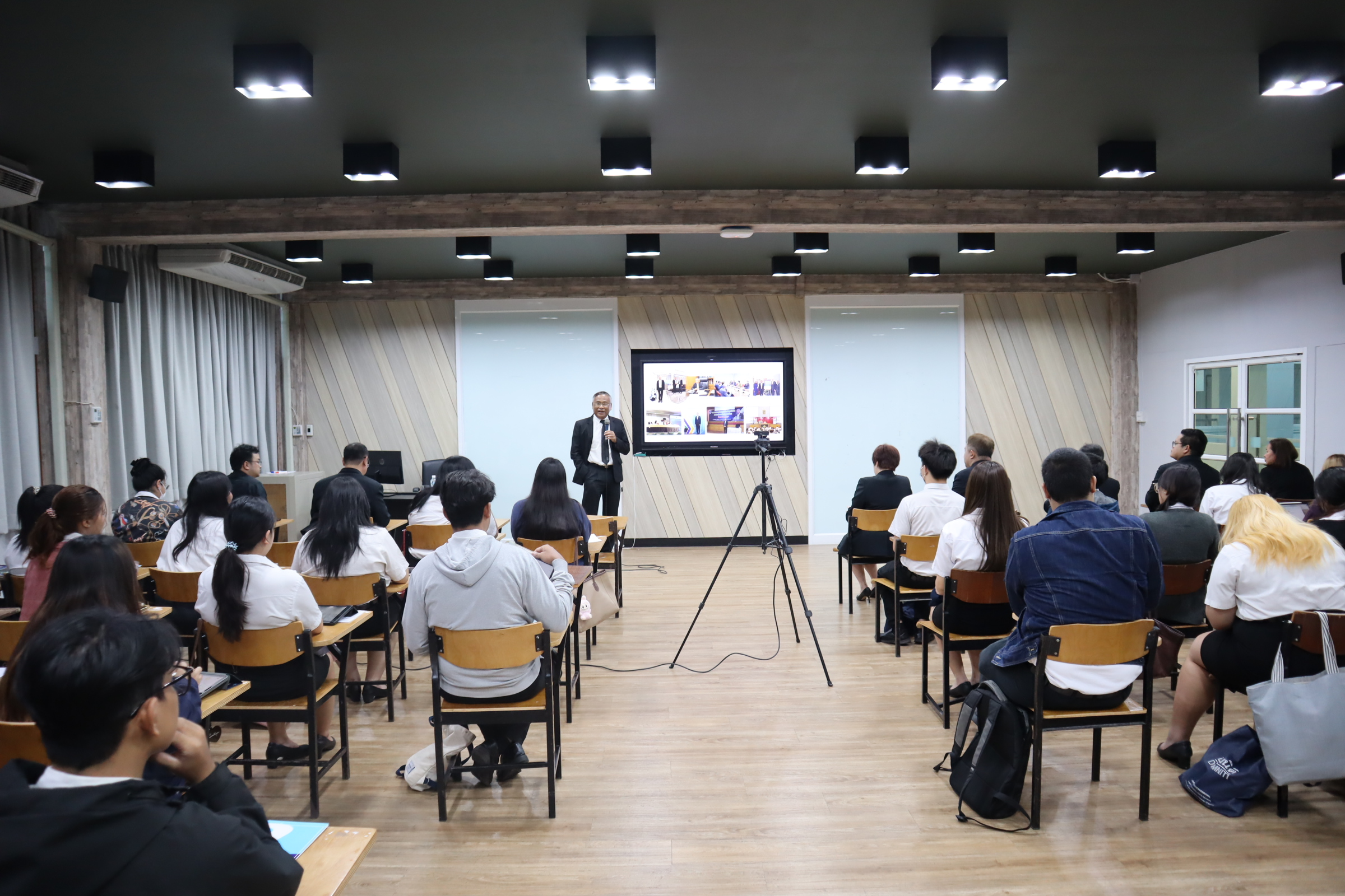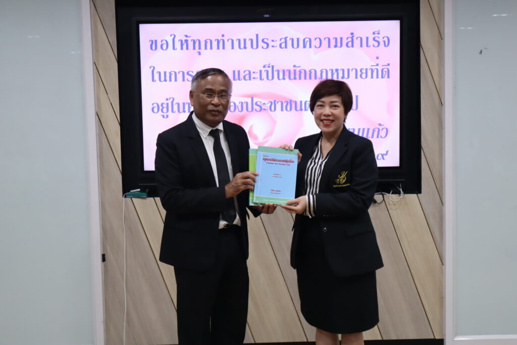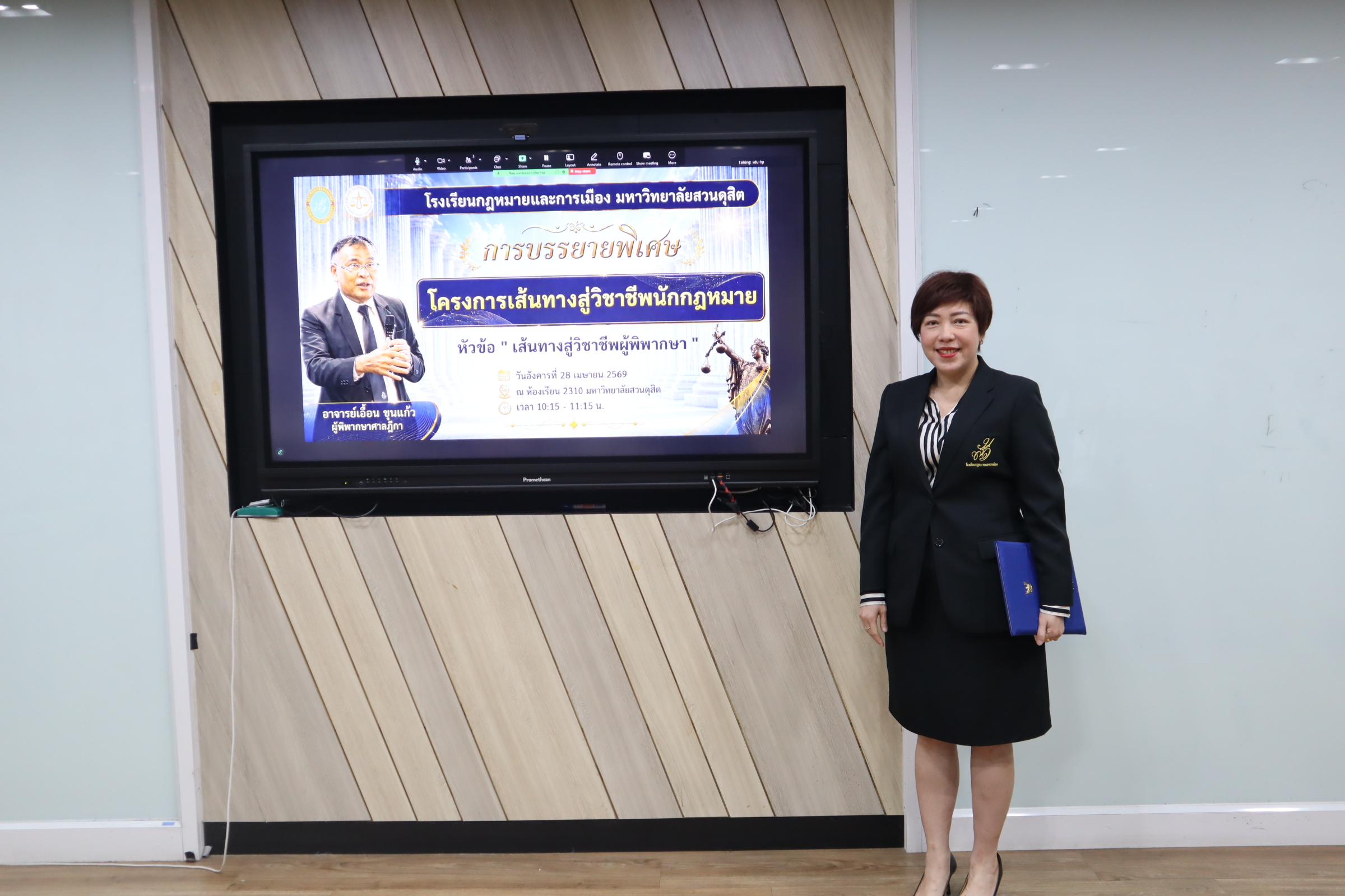 หลักสูตรนิติศาสตรบัณฑิต โรงเรียนกฎหมายและการเมือง จัดโครงการเส้นทางสู่วิชาชีพนักกฎหมาย โดยได้รับเกียรติจากท่านอาจารย์เอื้อน ขุนแก้ว ผู้พิพากษาศาลฎีกา บรรยายพิเศษในหัวข้อ ” เส้นทางสู่วิชาชีพผู้พิพากษา” ในการนี้ ดร.งามประวัณ เอ้สมนึก คณบดีโรงเรียนกฎหมายและการเมือง ได้กล่าวต้อนรับท่านวิทยากร และรายงานวัตถุประสงค์ของการจัดโครงการ วันอังคารที่ 28 เมษายน 2569 ณ ห้องเรียน 2310 อาคาร 2 ชั้น 3 มหาวิทยาลัยสวนดุสิต