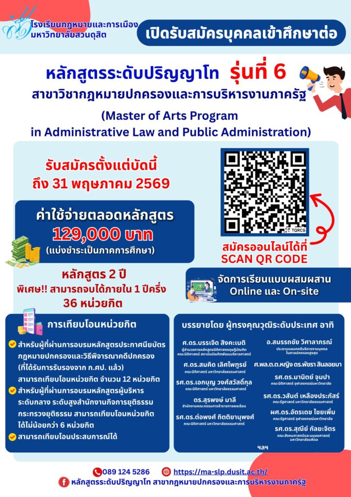 เปิดรับสมัคร ผู้สนใจเข้ารับการศึกษาระดับ ปริญญาโท สาขาวิชากฎหมายปกครองและการบริหารงานภาครัฐ รุ่นที่ 6 สมัครตั้งแต่บัดนี้ ถึง 31 พฤษภาคม 2569