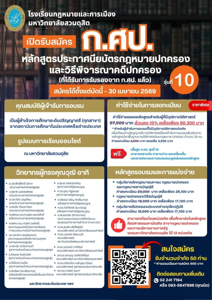 เปิดแล้ว ก.ศป. รุ่นที่ 10 โรงเรียนกฎหมายและการเมือง มหาวิทยาลัยสวนดุสิต เปิดรับผู้สนใจเข้าร่วมอบรม หลักสูตรประกาศนียบัตรกฎหมายปกครองและวิธีพิจารณาคดีปกครอง (ที่ได้รับการรับรองจาก ก.ศป. แล้ว) รุ่นที่ 10 รับสมัครตั้งแต่บัดนี้ – 30 เมษายน 2569