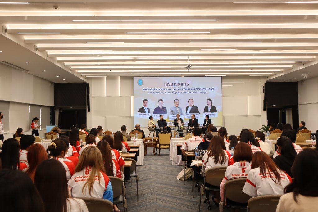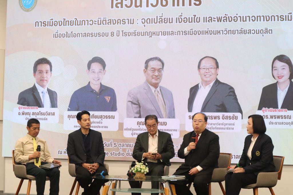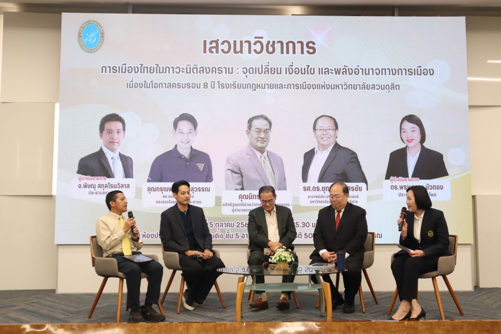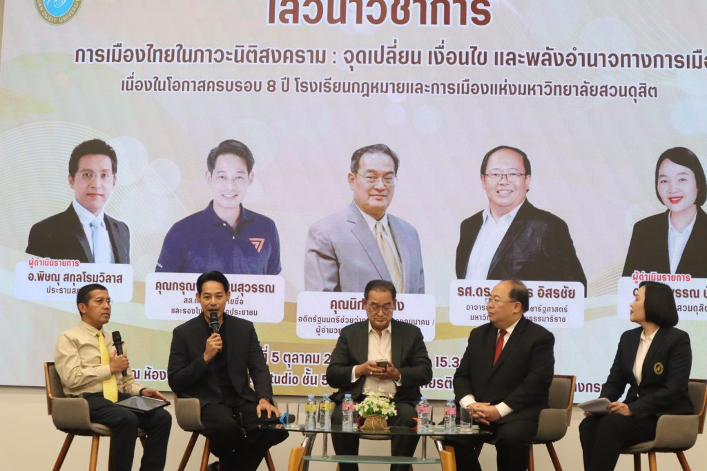โรงเรียนกฎหมายและการเมือง มหาวิทยาลัยสวนดุสิต จัดเสวนาวิชาการ เรื่อง “การเมืองไทยในภาวะนิติสงคราม : จุดเปลี่ยน เงื่อนไข และพลังอำนาจทางการเมือง” เนื่องในโอกาสครบรอบ 8 ปีโรงเรียนกฎหมายและการเมือง : อัตลักษณ์ใหม่แห่งมหาวิทยาลัยสวนดุสิต เมื่อวันที่ 5 ตุลาคม 2568