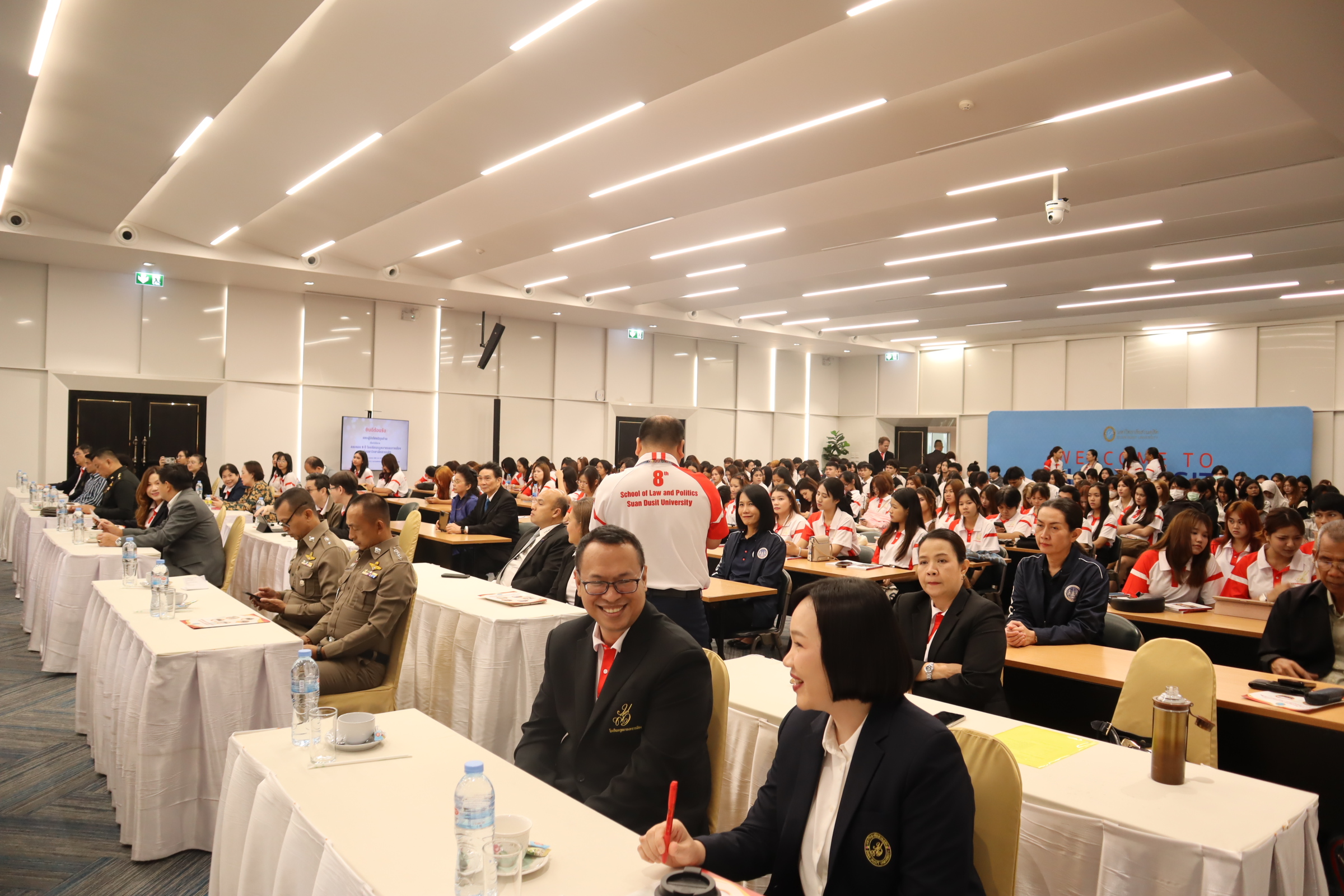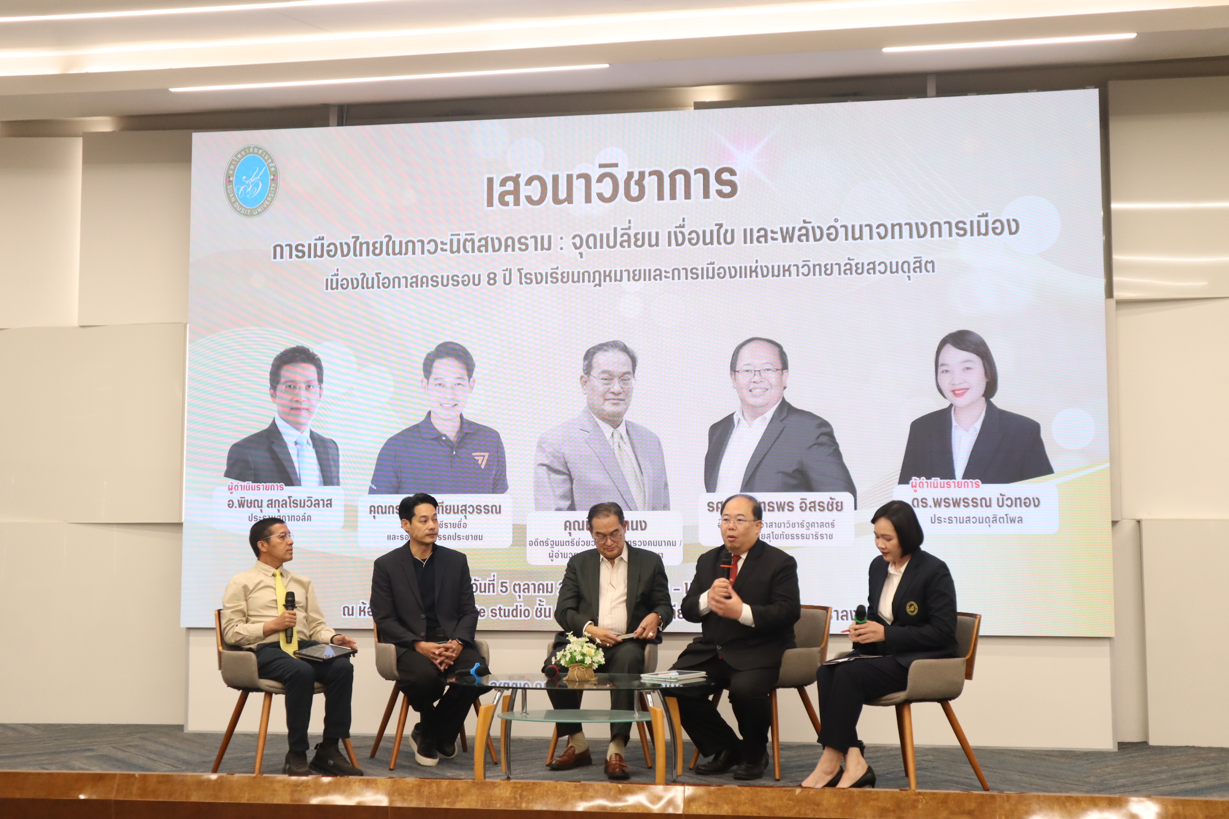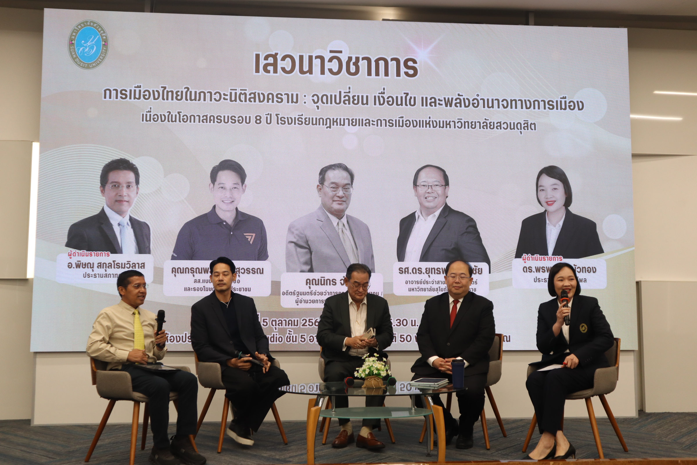 โรงเรียนกฎหมายและการเมือง มหาวิทยาลัยสวนดุสิต จัดเสวนาวิชาการ เรื่อง “การเมืองไทยในภาวะนิติสงคราม : จุดเปลี่ยน เงื่อนไข และพลังอำนาจทางการเมือง” เนื่องในโอกาสครบรอบ 8 ปีโรงเรียนกฎหมายและการเมือง : อัตลักษณ์ใหม่แห่งมหาวิทยาลัยสวนดุสิต เมื่อวันที่ 5 ตุลาคม 2568