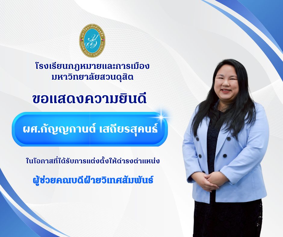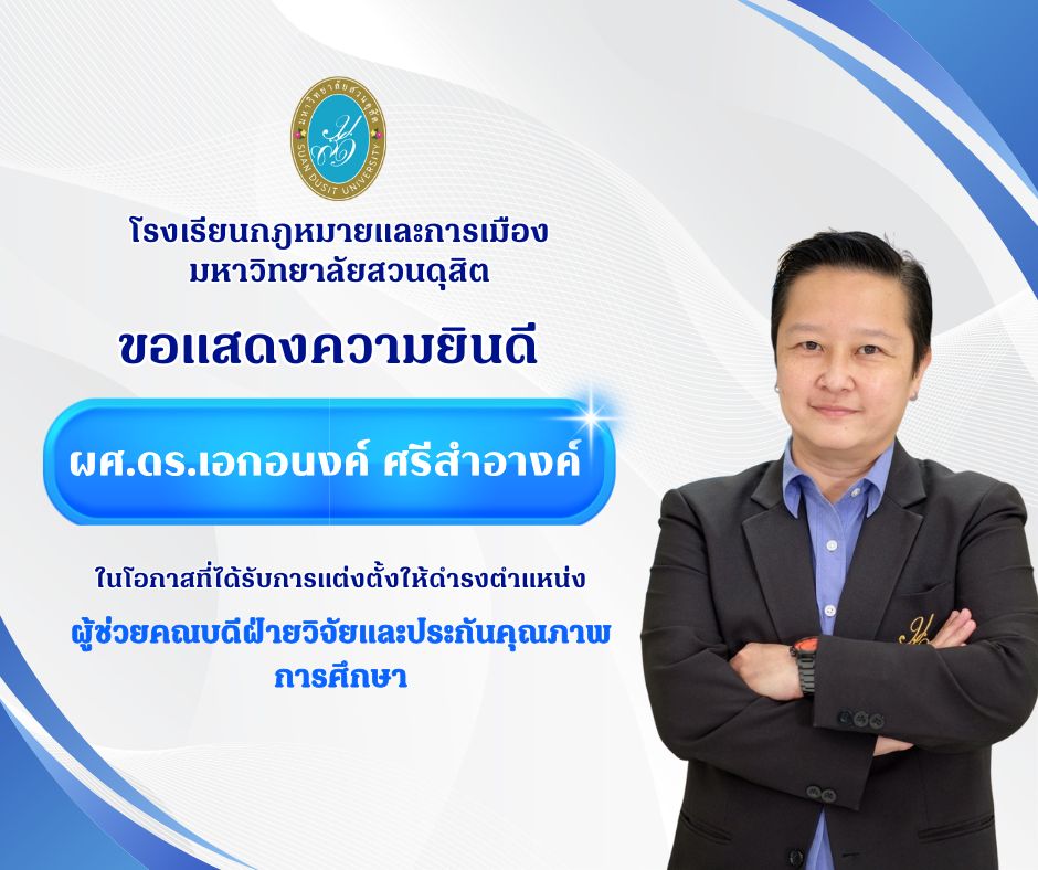 โรงเรียนกฎหมายและการเมือง มหาวิทยาลัยสวนดุสิต ขอแสดงความยินดี การแต่งตั้งให้ดำรงตำแหน่ง รองคณบดีฝ่ายวิชาการและนวัตกรรม , รองคณบดีฝ่ายกิจการนักศึกษาและบริการสังคม , ผู้ช่วยคณบดีฝ่ายวิจัยและประกันคุณภาพการศึกษา และผู้ช่วยคณบดีฝ่ายวิเทศสัมพันธ์ Post author:webslp2560 Post published:January 8, 2026 Post category:กิจกรรม / ข่าวประชาสัมพันธ์ You Might Also Like ประชุมสภามหาวิทยาลัยสวนดุสิต ครั้งที่ 9(13)/2567 September 30, 2024 รกม.มสด. รับสมัครผู้สนใจเข้ารับการอบรม หลักสูตรอบรมการไกล่เกลี่ยข้อพิพาท ตามพระราชบัญญัติการไกล่เกลี่ยข้อพิพาท พ.ศ. 2562 ที่คณะกรรมการพัฒนาการบริหารงานยุติธรรมแห่งชาติรับรอง รุ่นที่ 7 ตั้งแต่บัดนี้ถึง 31 สิงหาคม 65 August 2, 2022 การประชุมคณะทำงานคลังหน่วยกิต (Credit Bank) โรงเรียนกฎหมายและการเมือง อบรมร่วมกับกองบัญชาการศึกษา (บช.ศ.) หลักสูตรระยะสั้น เพื่อสะสมในระบบคลังหน่วยกิต วันที่ 25 กุมภาพันธ์ 2568 March 13, 2025