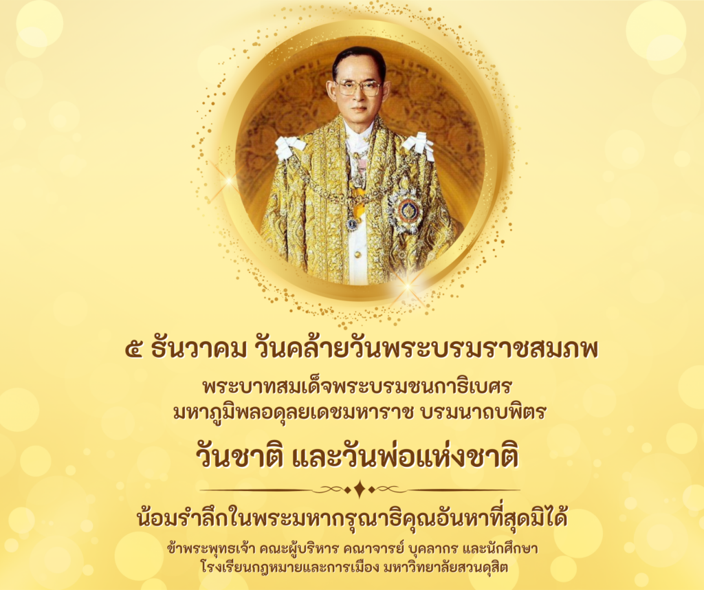 ๕ ธันวาคม ๒๕๖๘ วันคล้ายวันพระบรมราชสมภพ พระบาทสมเด็จพระบรมชนกาธิเบศร มหาภูมิพลอดุลยเดชมหาราช บรมนาถบพิตร “วันชาติ และวันพ่อแห่งชาติ” น้อมรำลึกในพระมหากรุณาธิคุณอันหาที่สุดมิได้ ข้าพระพุทธเจ้า คณะผู้บริหาร บุคลากร และนักศึกษา โรงเรียนกฎหมายและการเมือง มหาวิทยาลัยสวนดุสิต Post author:webslp2560 Post published:December 4, 2025 Post category:กิจกรรม / ข่าวประชาสัมพันธ์ You Might Also Like ลงทะเบียนร่วมรับฟัง Research Talk ครั้งที่ 6 การวิจัยบนฐานของ SDG 10 : ลดความไม่เสมอภาคภายในประเทศและระหว่างประเทศ ในวันที่ 24 เมษายน 2567 เวลา 15.30 – 16.30 น. ออนไลน์ผ่าน Zoom และออนไซต์ ณ Poll Cafe มหาวิทยาลัยสวนดุสิต April 5, 2024 รกม.มสด. จัดอบรมหลักสูตร ประกาศนียบัตรกฎหมายปกครองและวิธีพิจารณาคดีปกครอง (ที่ได้รับการรับรองจาก ก.ศป. แล้ว) รุ่นที่ 3 ในวันที่ 27 มีนาคม 2564 โดยได้รับเกียรติจาก ศ.ดร.ดาราพร ถิระวัฒน์ March 29, 2021 วันนวมินทรมหาราช 13 ตุลาคม น้อมรำลึกในพระมหากรุณาธิคุณ พระบาทสมเด็จพระบรมชนกาธิเบศร มหาภูมิพลอดุลยเดชมหาราช บรมนาถบพิตร October 12, 2023