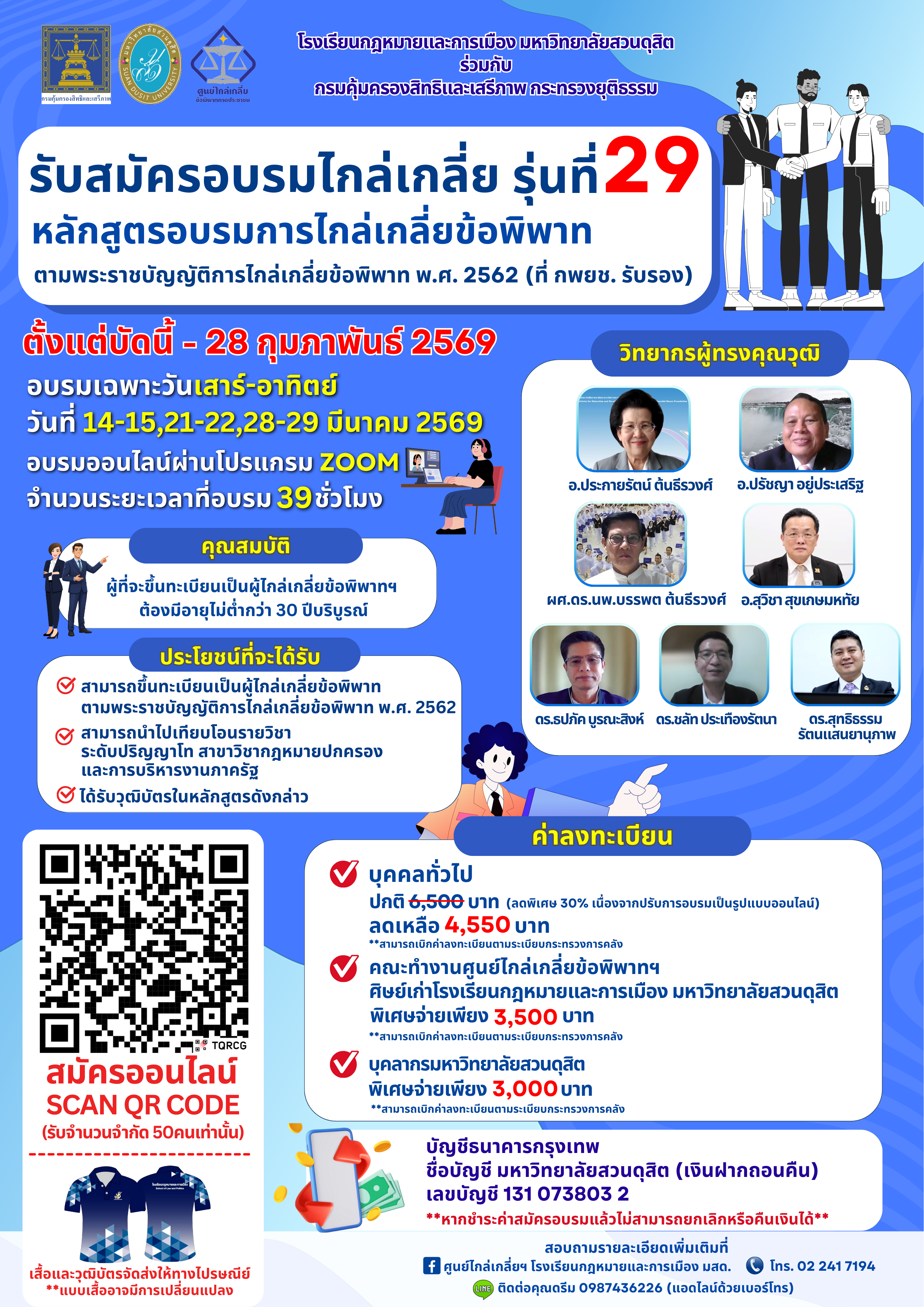 โรงเรียนกฎหมายและการเมือง มหาวิทยาลัยสวนดุสิต รับสมัครผู้สนใจเข้ารับการอบรม หลักสูตรอบรมการไกล่เกลี่ยข้อพิพาท ตามพระราชบัญญัติการไกล่เกลี่ยข้อพิพาท พ.ศ. 2562 ที่คณะกรรมการพัฒนาการบริหารงานยุติธรรมแห่งชาติรับรอง รุ่นที่ 29 สมัครได้ตั้งแต่บัดนี้ จนถึงวันที่ 28 กุมภาพันธ์ 2569webslp2560January 12, 2026กิจกรรม, ข่าวประชาสัมพันธ์